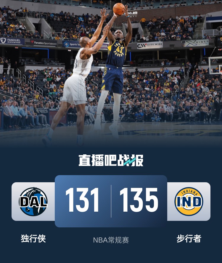 比赛开始,双方上来状态比较慢热,内姆哈德和内史密斯一内一外带队建立主动权,西卡和内史密斯三分再进,步行者首节领先12分,次节双方展开精彩对攻战,托平再次成为奇兵接连外线发炮砍分,但华盛顿里突外投单节13分强势回应,步行者多点开花半场还领先11分。下半场,独行侠多点开花开始发力追分,丁威迪手感回暖单节上双,哈迪、马绍尔三节也都得分上双,西卡苦苦支撑,独行侠三节反超1分,末节独行侠继续全员发力扩大领先一度领先到双位数,内史密斯连续三分,马瑟林接连冲击内线,步行者12-3再次咬住比分,华盛顿连续罚球扩大到两球以上领先,最后时刻双方罚球大战,克里斯蒂失误后内姆哈德三分反超,哈迪致命进攻犯规,最终步行者135-131逆转独行侠,送4连败。