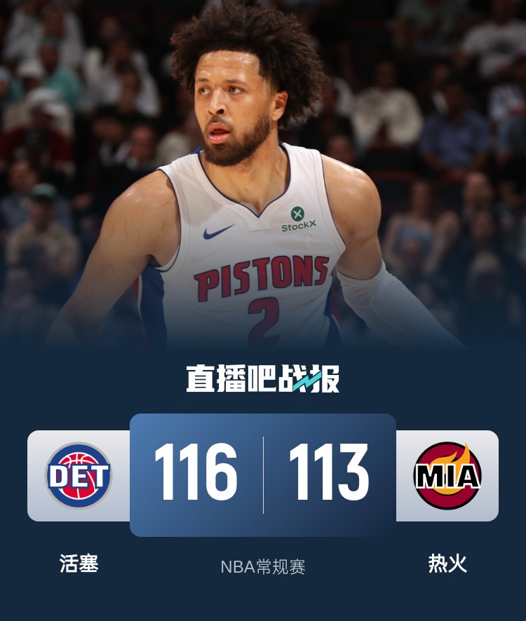 康宁汉姆25+12+11三分绝杀 阿德巴约30+9+8 活塞送热火9连败