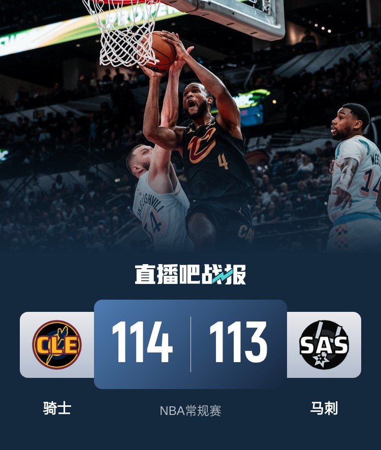 比赛开始,骑士开场外线手感火热,连中6记三分打出不错开局建立主动权,马刺全民皆兵苦苦支撑,骑士继续外线发炮首节10记三分领先10分,次节双方命中率都有下降,骑士替补也有发挥扩大到20分以上领先,随后马刺苦苦追分半场追到差17分。下半场,双方展开拉锯战,骑士攻防两端有些松懈,瓦塞尔里突外投带领马刺连续打出小高潮,尚帕尼接连三分一度追到6分,末节梅里尔和米切尔连续3记三分重新拉开比分,但瓦塞尔外线依然能回应,随后巴恩斯接连三分命中,马刺14-2追到仅差1分,米切尔突破被帽,但巴恩斯勾手绝杀未中,最终骑士114-113险胜马刺,拿到3连胜。