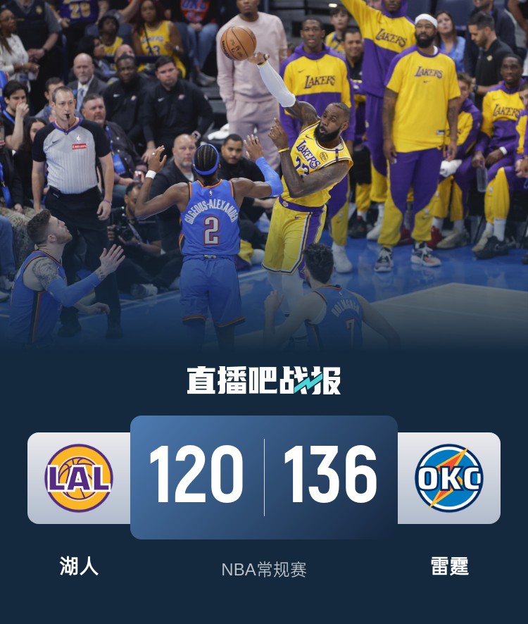 此役一上来双方迅速拉开对攻,东契奇和里夫斯联手取分,芬尼-史密斯外线续上火力,亚历山大连投带罚予取予求,切特和多特连中三分,两队你来我往43平结束首节,次节回来,杰伦-威廉姆斯突然发力单节贡献13分,中段湖人进攻停滞,詹姆斯和东契奇罚球止血,半场战罢,雷霆领先8分。易边再战后雷霆进攻突然哑火,詹姆斯和东契奇接连打进,湖人抓住机会顺势反超,三节结束后湖人领先1分,末节决战,东契奇不满判罚领到第二个技犯被驱逐,亚历山大联手杰伦-威廉姆斯夺回优势,雷霆气势如虹彻底拉开比分,湖人回天乏术投子认负,最终雷霆136-120大胜对手。