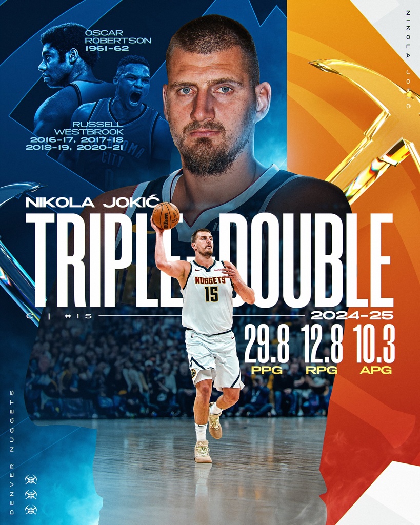 史诗级约基奇场均三双为历史中锋首人 场均轰29.8+12.8+10.3