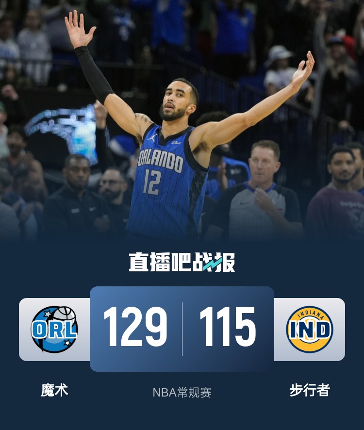 比赛开始,魔术率先发力建立主动权,麦康纳有攻有传带领步行者咬住比分,昆顿-杰克逊里突外投连砍7分反超比分,首节双方打成29平,次节魔术上来发力17-4攻击波领先双位数,麦康纳上场止血,但魔术连续反击一波14-0一度拉开近30分领先,半场魔术领先到23分。下半场,魔术上来连中三分一波17-5攻击波直接拉开30分以上领先,步行者连续外线发炮追分,魔术能回应三节还是领先30分,末节双方开始练兵,魔术始终保持住30分左右领先,步行者一波小高潮追至20分以内,最终魔术129-115轻取步行者,拿到5连胜同时终结对手6连胜。