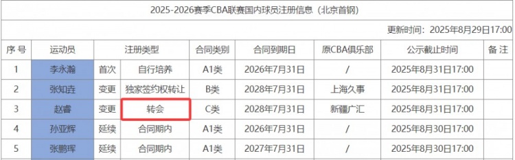 注册信息显示赵睿是转会 因此新疆和赵睿是先终止D类合同再签C类