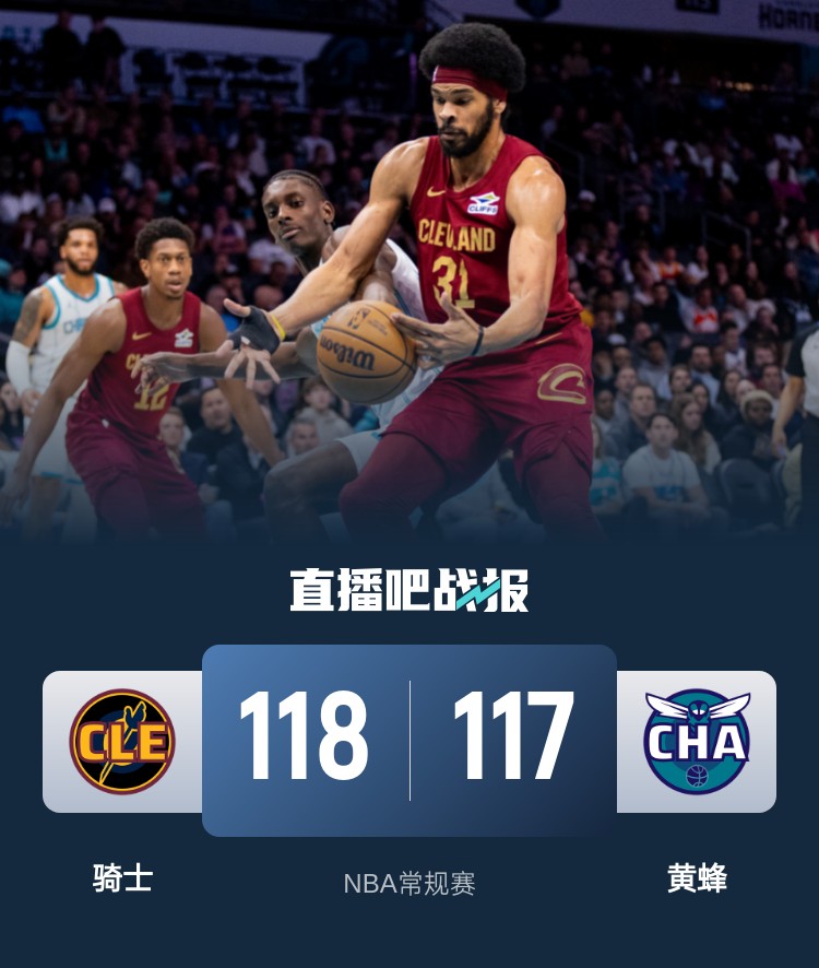 比赛开始,加兰上来连续扔进三分,但小桥状态火热,里突外投连砍15分强势回应,双方命中率一般但展开拉锯战,米切尔压哨上篮助骑士打平黄蜂,次节梅里尔接连三分命中帮助骑士建立主动权,三球接连三分回应,但亨特里突外投助队14-3半场领先11分。下半场,双方展开拉锯战,小桥连续突破抛投单节再轰14分带队追分,但骑士全民皆兵回应,萨隆接连三分追到差4分,末节骑士突然断电,打了半节多得分还未上双,努尔基奇连续内线打成,鲍也能连续攻筐,黄蜂反超并领先到近10分,骑士接连罚球追分,小莫布里三分追平,比赛进入白热化,亨特关键补篮,小桥致命失误后三分续命,随后双方都无暂停,玩起“点球”战术,米切尔最后两罚不中,但小桥中线绝杀三分不中,最终骑士118-117险胜黄蜂,豪取13连胜同时送对手9连败。
