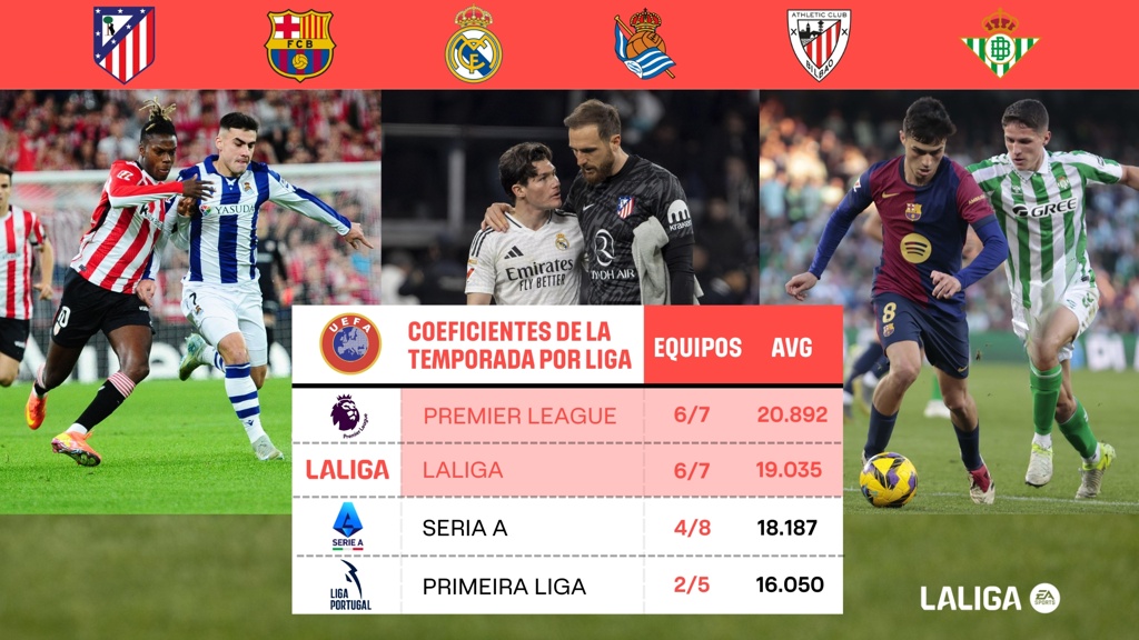 这些西班牙球队在欧战中的出色成绩,以及他们在此期间获得的一些重要胜利,提升了西班牙在欧足联官方国家排名中的积分系数。2024-25赛季,只有英格兰俱乐部的欧战积分均分(20.892)高于西班牙俱乐部(18.820)。
