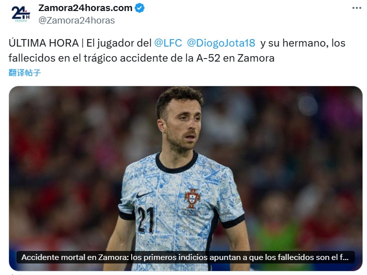 西媒报道车祸细节:事故发生于今天凌晨,若塔和25岁弟弟双双遇难