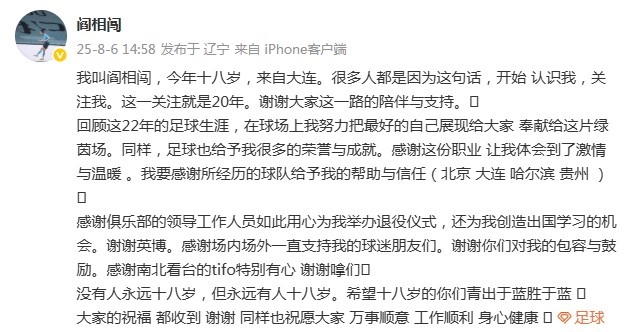 8月6日讯 今年夏季间歇期,大连英博老将阎相闯宣布退役,随后英博俱乐部也为他举办了退役仪式。通过微博,阎相闯发布了自己的退役感言,并向大家送上了祝福。