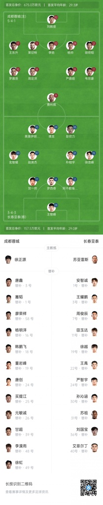 首尾对决!蓉城vs亚泰首发:韦世豪、胡荷韬先发,谭龙彭欣力登场