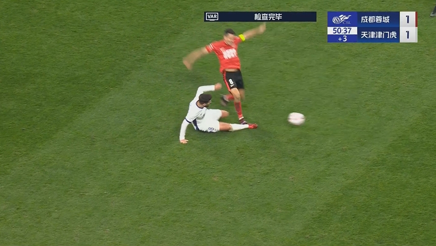 【判例二】:中超联赛第2轮,成都蓉城VS天津津门虎,比赛第45+3分钟,成都蓉城8号队员在争抢球时疑似踩踏天津津门虎8号队员,裁判员未判罚犯规,VAR介入,裁判员经在场回看后,判罚成都蓉城8号队员严重犯规,并向其出示红牌罚令出场。