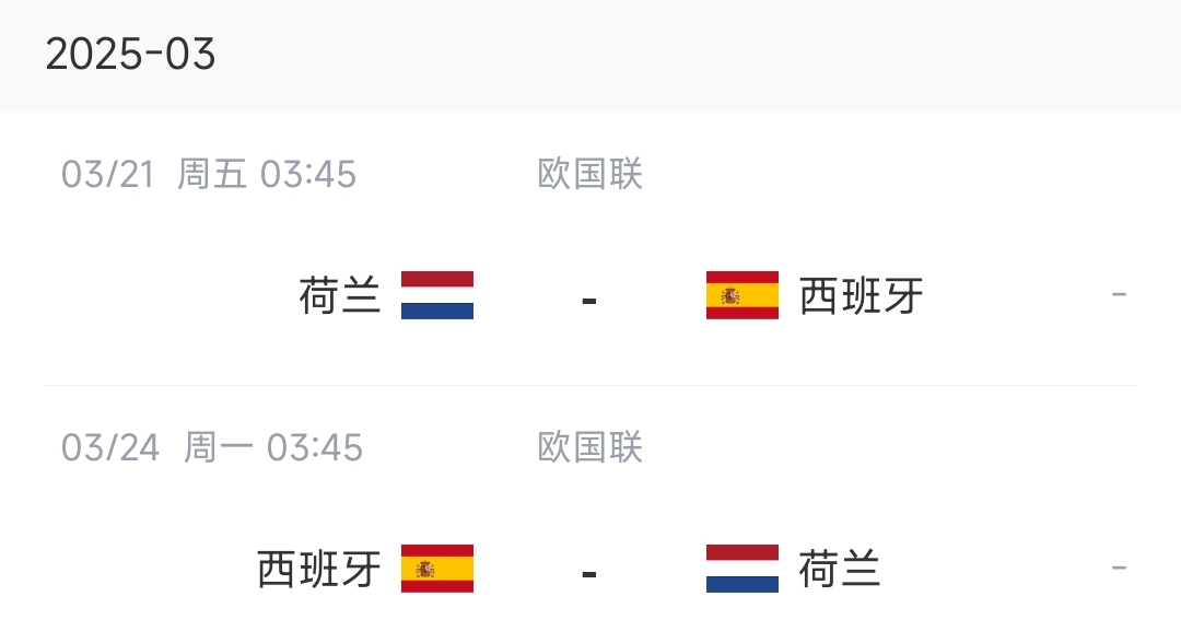 3月份国际比赛日中,西班牙将在欧国联1/4决赛迎来与荷兰队的两回合比赛,比赛时间为3月21日和3月24日,西班牙先客后主。
