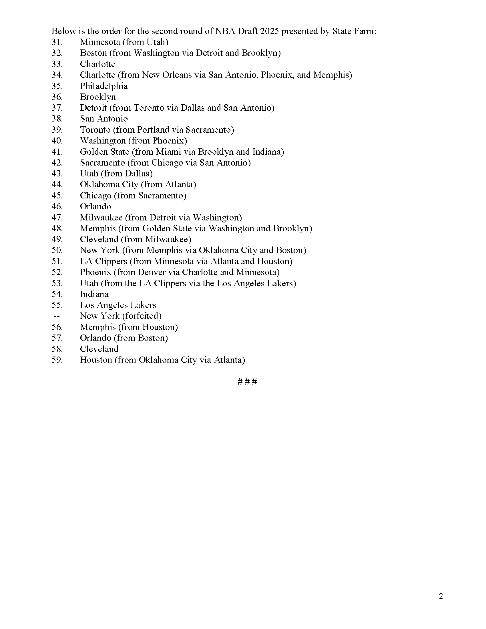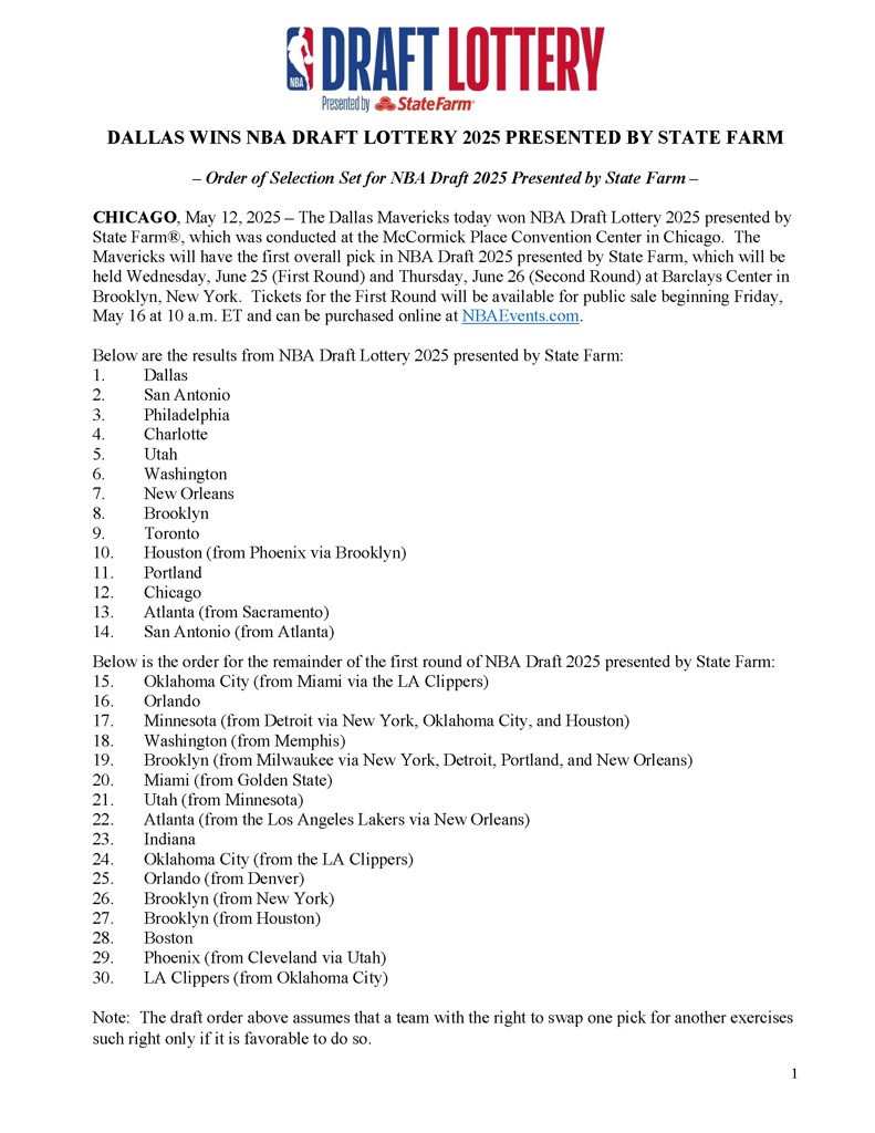 NBA官方就此公布了2025年NBA选秀的全部59个选秀权具体顺序(尼克斯此前因违规招募布伦森被罚掉了原第56顺位的次轮签),详情如下(按顺序):
