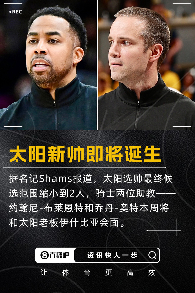 06月03日讯 据ESPN名记Shams Charania报道,多位消息人士透露,太阳新任主帅最终候选人缩小到两人,骑士两位助教——约翰尼-布莱恩特与乔丹-奥特本周晚些时候将在密歇根和太阳老板伊什比亚、CEO约什-巴特尔斯坦以及新任总经理布莱恩-格雷戈里会面。