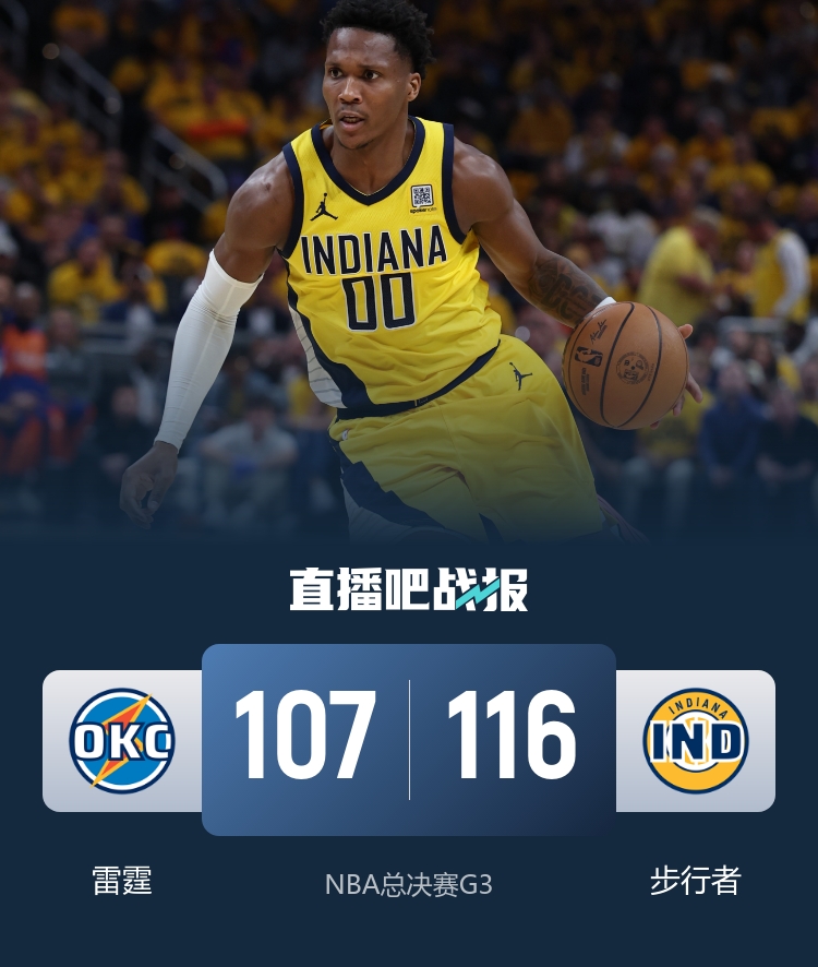 6月12日讯 NBA总决赛G3今日继续开打,步行者回到主场迎战雷霆。两支球队在前两场比赛中各胜一场,目前大比分是1-1战成平手。