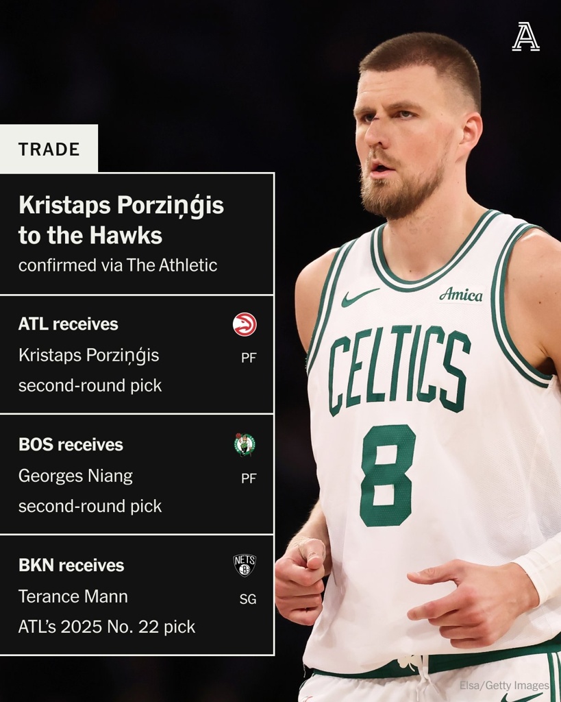 06月25日讯 据ESPN名记Shams Charania报道,多位消息人士透露,凯尔特人、老鹰和篮网敲定以波尔津吉斯为主体的三方交易,详情如下: