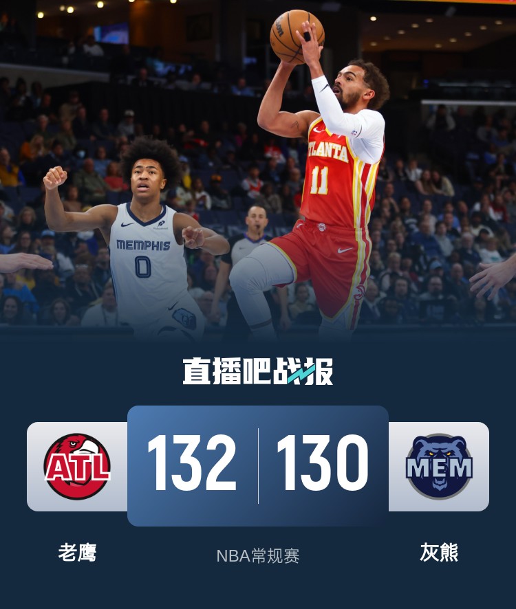 首节开打后双方互相试探,奥孔武和丹尼尔斯连续杀伤,贝恩连投带罚单节13分强势回应,灰熊稳扎稳打领先6分结束首节争夺,次节回来,里萨谢和马修斯连中三分,两人联手率队连续轰出得分高潮,半场战罢,老鹰反超5分。易边再战后两队你来我往比分紧咬,贝恩无人可挡予取予求,灰熊气势如虹夺回优势,并带着6分领先进入末节,末节决战,肯纳德突然发力接连打进,老鹰回敬9-2小高潮拉回悬念,决胜时刻勒韦尔连拿5分抹平分差,丹尼尔斯致命抢断,长传助勒韦尔上演压哨绝杀,最终老鹰132-130力克对手终结连败,同时送给灰熊三连败。
