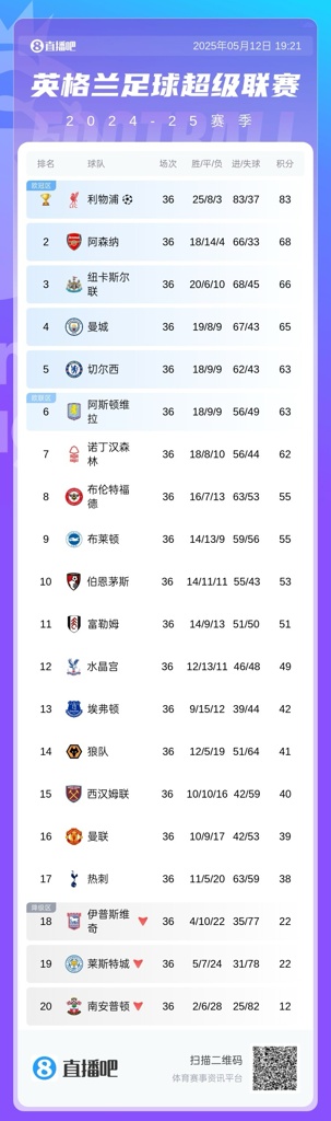 曼联目前36轮积39分,位居英超积分榜的第16名,球队输掉了本赛季近一半的联赛场次,并且已打破多项尘封多年的队史最差纪录。