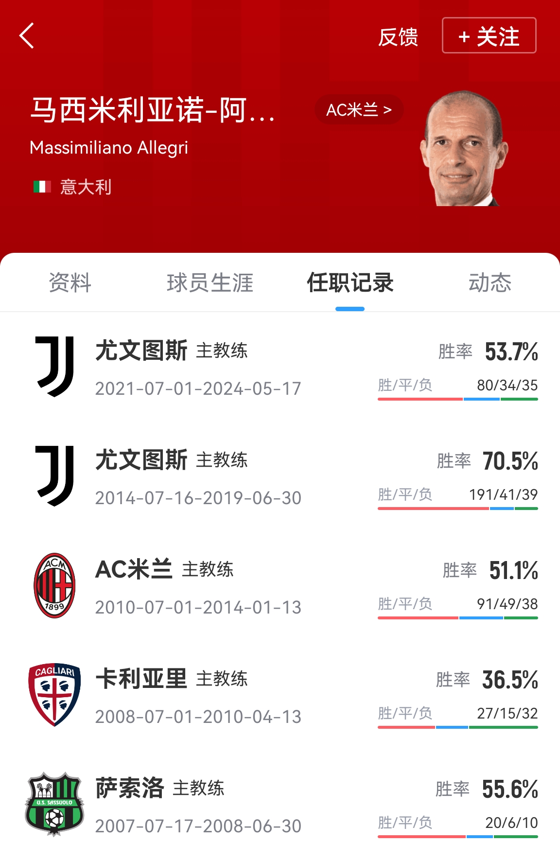 57岁的意大利籍教练阿莱格里,曾执教卡利亚里、AC米兰、尤文图斯等多支球队。2010年-2014年间,阿莱格里执教AC米兰夺得1座意甲冠军、1座意大利超级杯冠军。自2024年5月卸任尤文主帅后,阿莱格里一直赋闲至今。