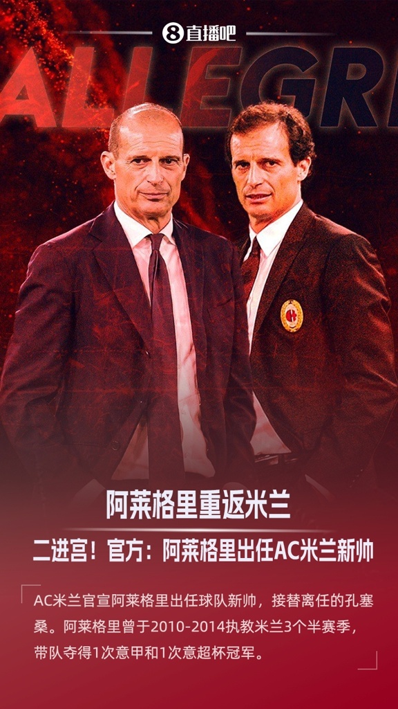 二进宫!官方:阿莱格里出任AC米兰新帅,接替孔塞桑