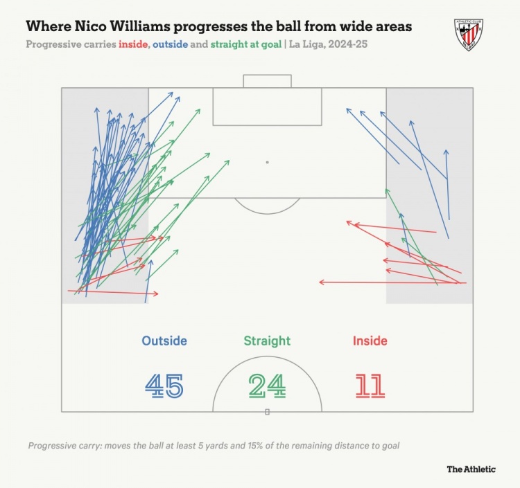 尼科喜欢在左边路并拉开宽度,这在他能够快速切入底线并回传时尤其有效,但尼科的比赛风格也充满不可预测性。这名边锋既能内切射门,也能直接冲入危险区域。