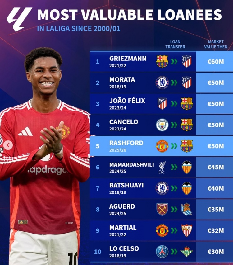 西甲新世纪租将身价榜:格子居首,莫拉塔&菲利克斯&拉什福德在列