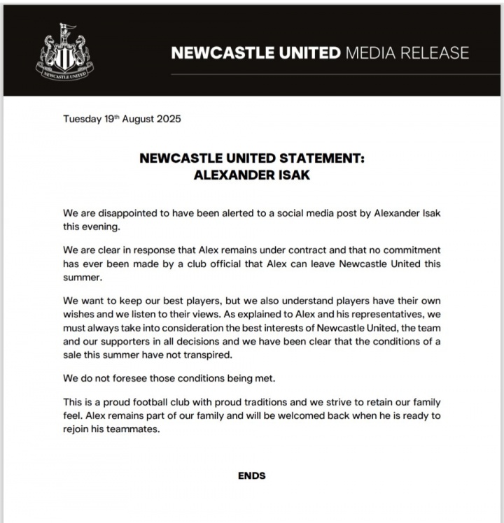 纽卡在声明中表示:今夏转会条件尚未达成,球队也不认为这些条件会得到满足。因此伊萨克大概率走不了,但喜鹊随后在文末示好:亚历山大仍是我们大家庭的一员,当他准备好重返球队时,我们将热烈欢迎他回归。