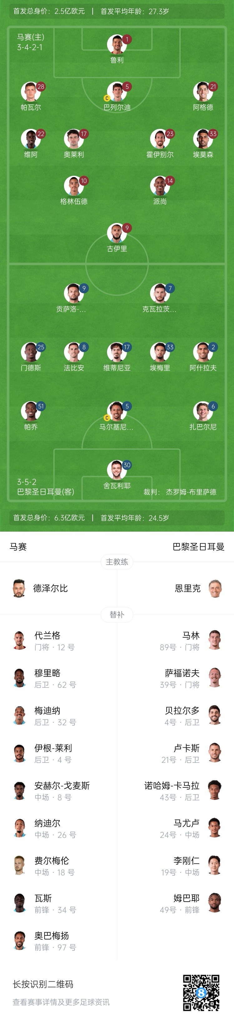 9月23日讯 北京时间今天2点 ,法甲第5轮马赛vs巴黎,此役双方首发已经公布。