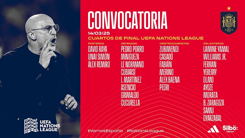 前锋:亚马尔(巴萨)、尼科-威廉姆斯(毕尔巴鄂竞技)、费兰(巴萨)、皮诺(比利亚雷亚尔)、奥尔莫(巴萨)、阿约泽-佩雷斯(比利亚雷亚尔)、莫拉塔(加拉塔萨雷)、萨拉戈萨(奥萨苏纳)、萨穆-阿格霍瓦(波尔图)、奥亚萨瓦尔(皇家社会)